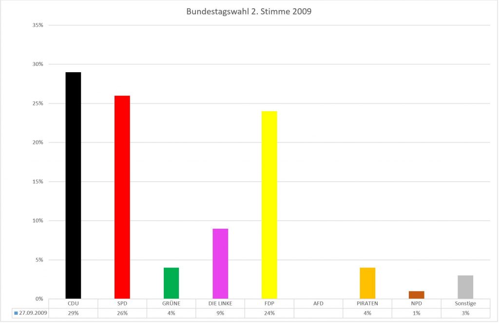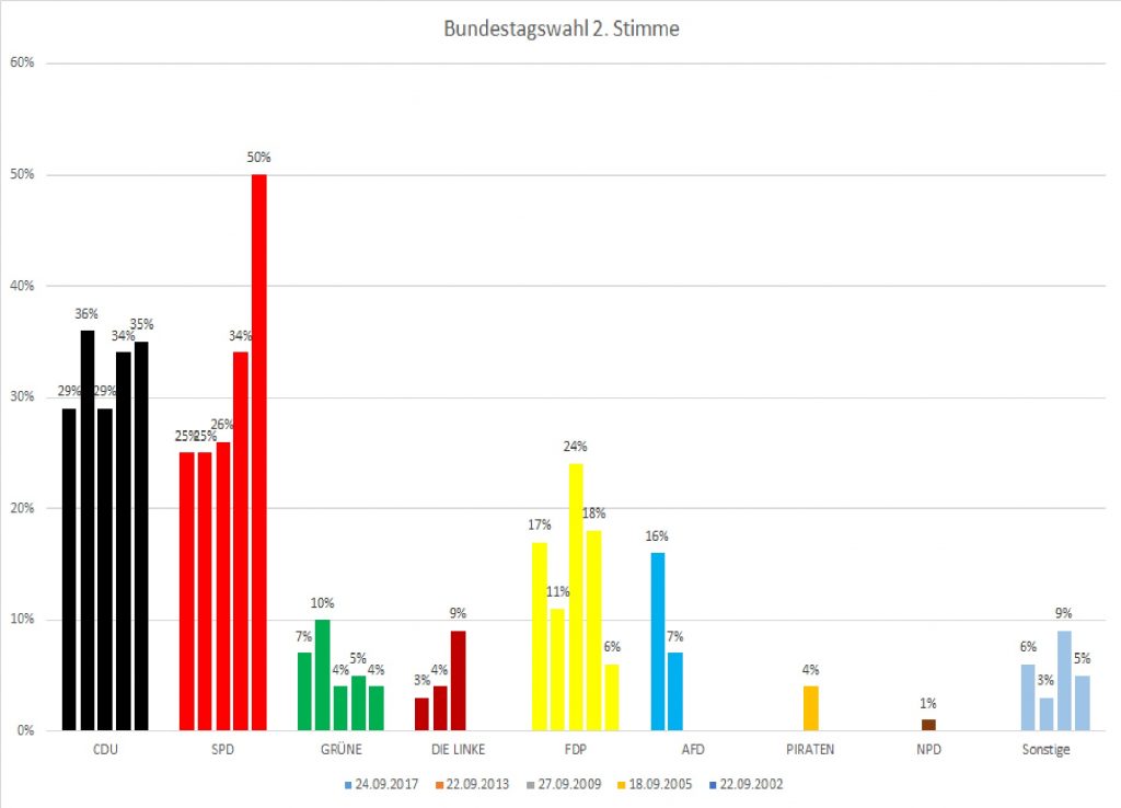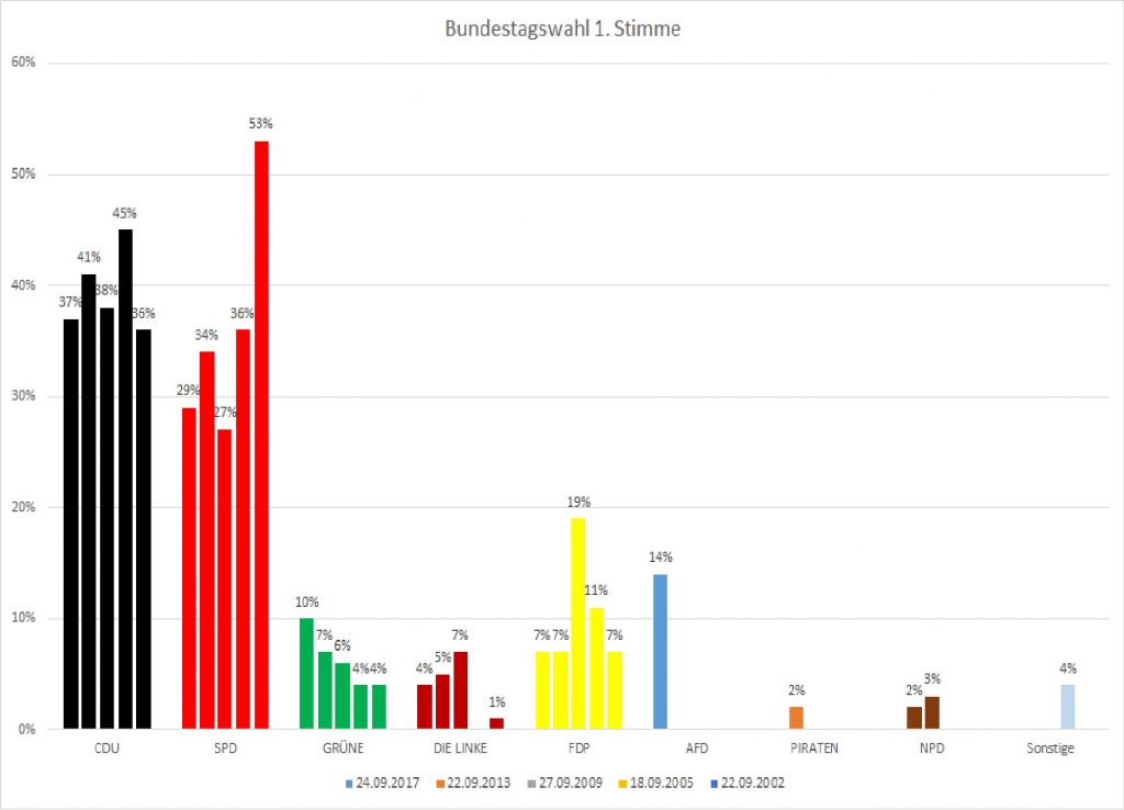 Bundestagswahlen Die Ergebnisse der Bundestagswahlen seit 2002. Dabei wird unterteilt in „erste Stimme“ und „zweite Stimme“ nach Parteien. Dabei ist zeitlich ganz links außen das früheste Datum.